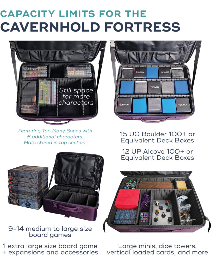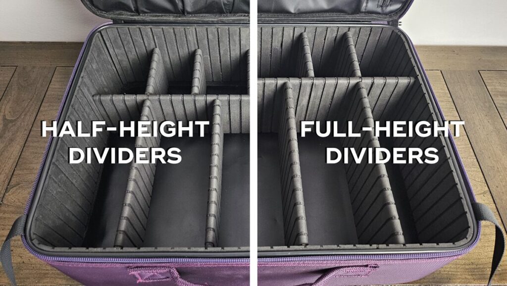 The Fortress is substantially deeper. Because of this, we provide two sets of dividers. The installed set is the full depth of the bottom layer of the case. The second set a shorter variation of the first set to allow a similar depth to the Armory while providing additional large-format space to lay across these dividers. The Fortress also comes with a second strap to make into a backpack configuration.
