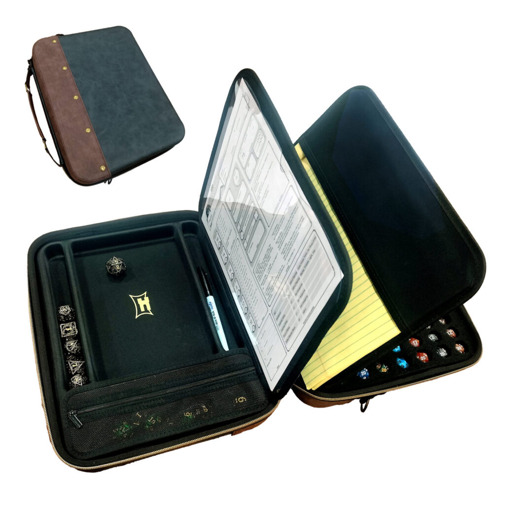 An all-in-one storage case for RPG players. Includes a built-in dice tray, storage for dice, minis, cards, pens, books, tablets, and more. Simply open the Archive, and you’re ready to start playing.
