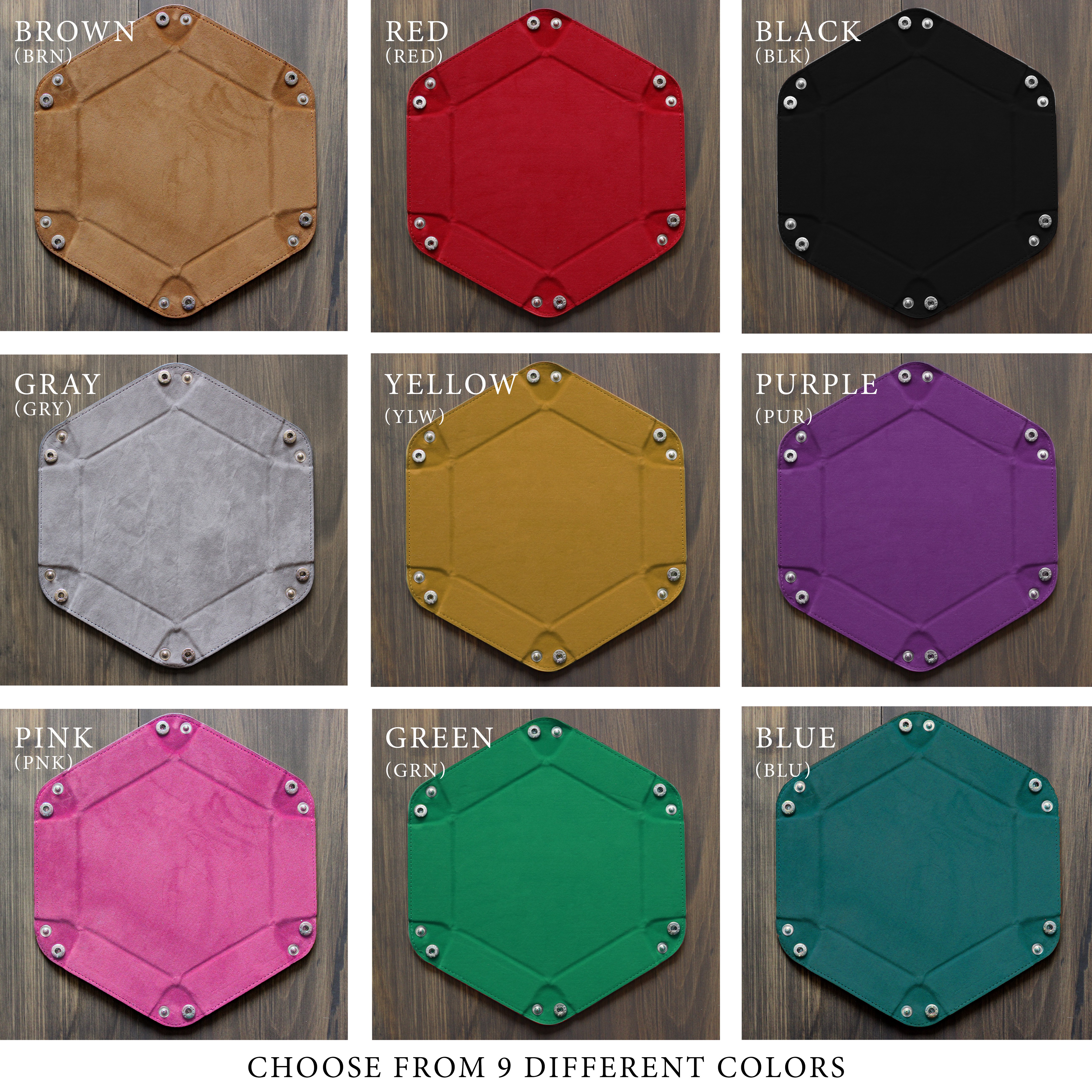 The nine color options are brown, red, black, gray, yellow, purple, pink, green, and blue. If you would like to request a different dice tray color that is not listed, please reach out to me with your suggestion and I will try to accommodate your request to the best of my ability. Feel free to also give suggestions for future designs.