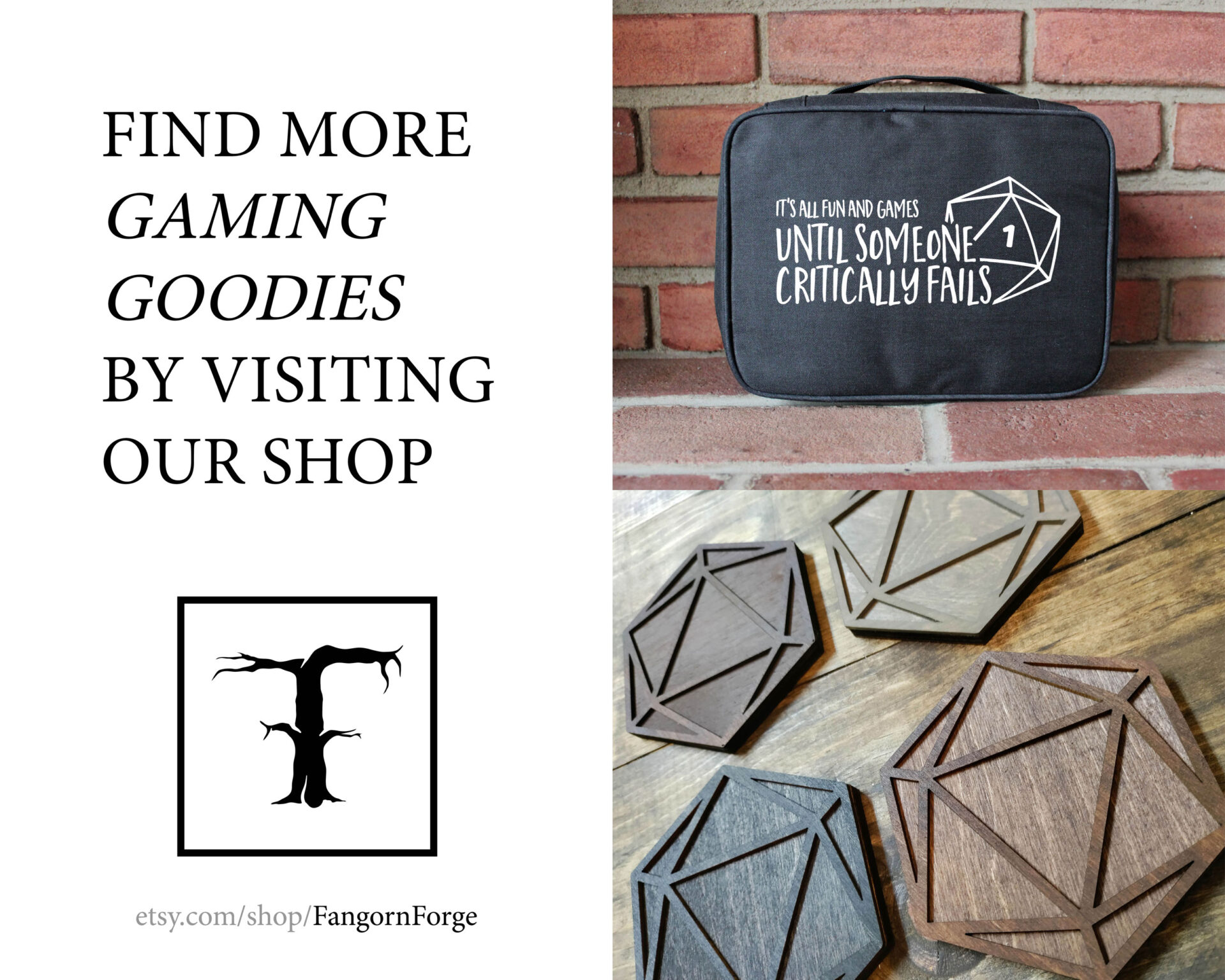 Each tray measures 10.5 x 9.5 inches open and 8.7 x 7.4 x 1.6 inches closed. The snaps allow you to transport your tray flat or if you are interested in buying a new bag to hold all of your RPG gear, you can fit this tray into our game bags already assembled. All you have to do is pull it out of the bag to get started with your game session. Head over to our shop at FangornForge to find our other RPG accessories.