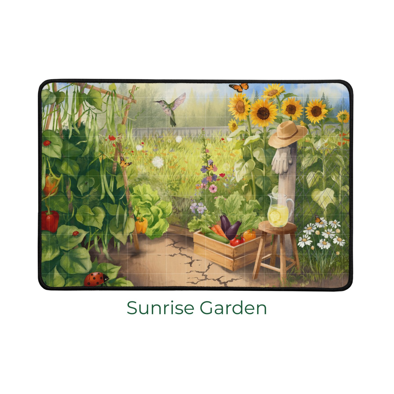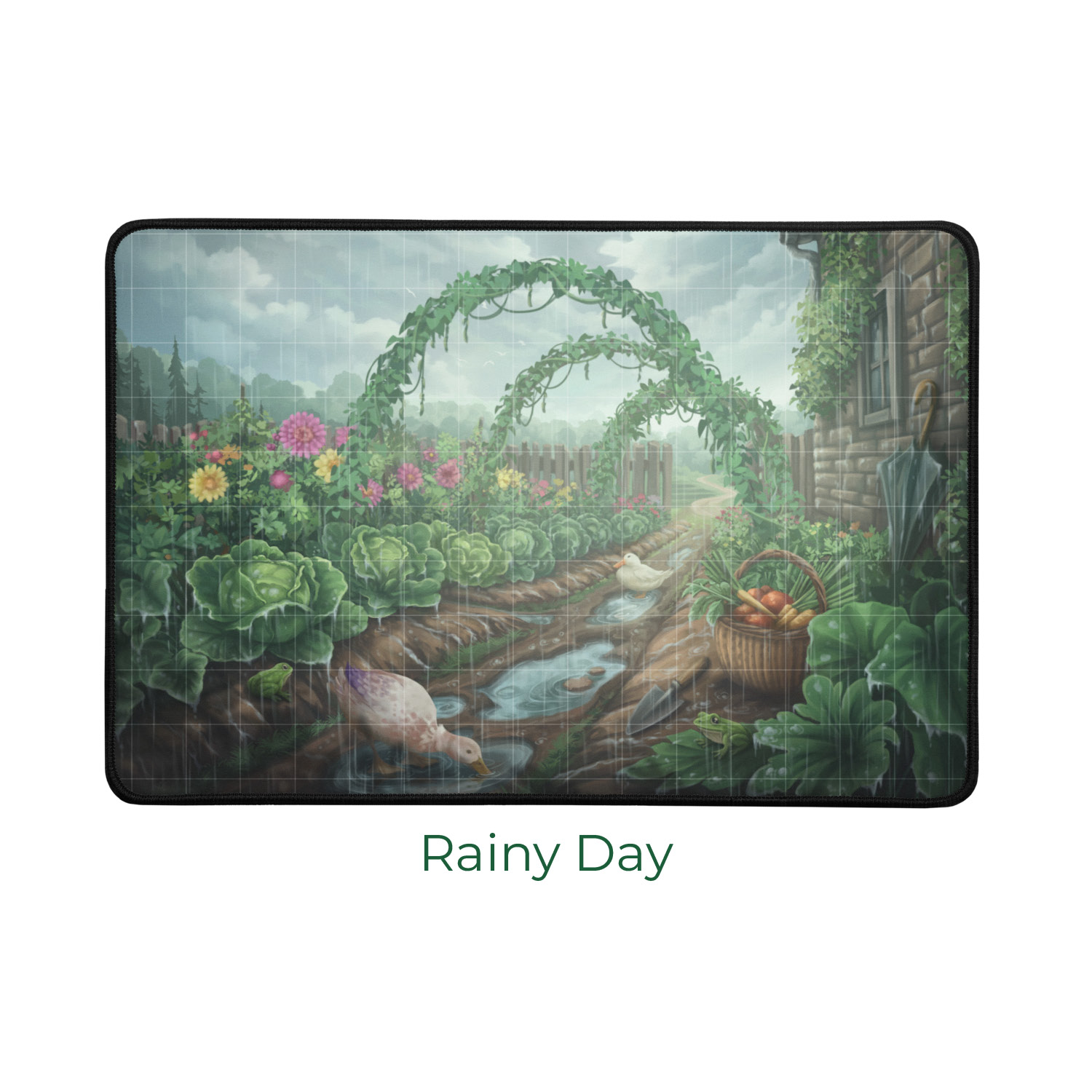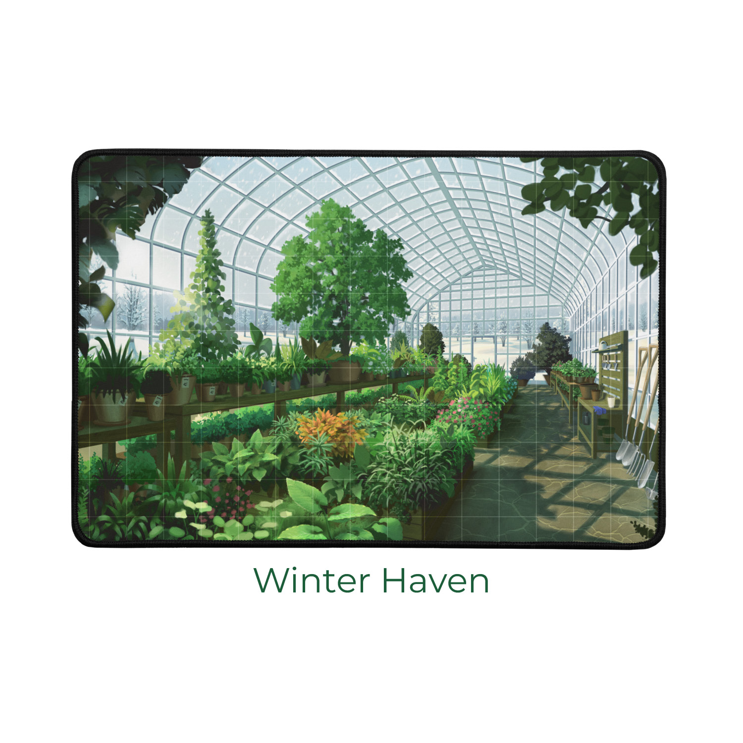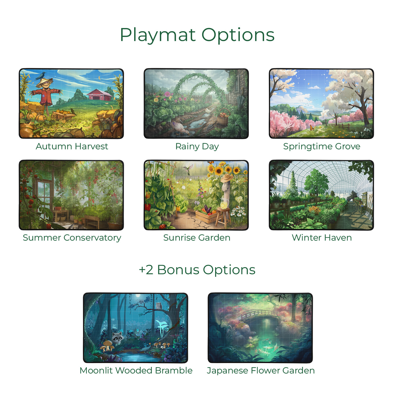 Each Vine playmat measures 16 x 12 inches, giving you a clearly defined personal growing space while maintaining a compact footprint at the table. The surface features a subtle, light alignment grid to help you place stems, leaves, and water droplets with precision—without distracting from the stunning artwork. The grid is intentionally understated, ensuring the premium illustration remains the focal point of your play area.